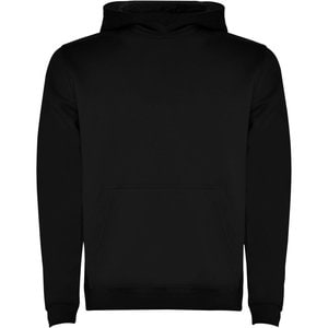 Two-colour hoodie with double fabric. Reinforced covered seams in collar and kangaroo style pocket. 1x1 elastane rib in cuffs and waistband. Removable label. The model is 120 cm and is wearing size 5/6.