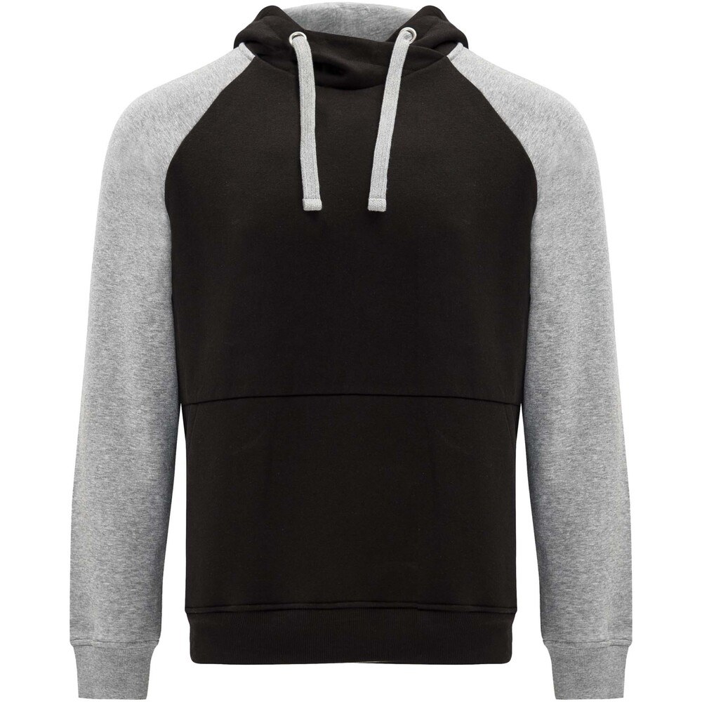 Two-colour unisex hoodie. Hood with crossed neck and metal eyelets. Contrasting inner hood, drawcord and raglan sleeves. Kangaroo pocket. Cuffs and hem in 1x1 elastane rib knit. Removable label.